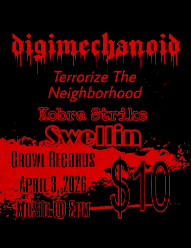 See Digimechanoid, Terrorize the Neighborhood, Kobra Strike (Houston), and Swellin (Austin) perform at Growl Records. A Texas mixed bill with something for everyone! Cover is $10.